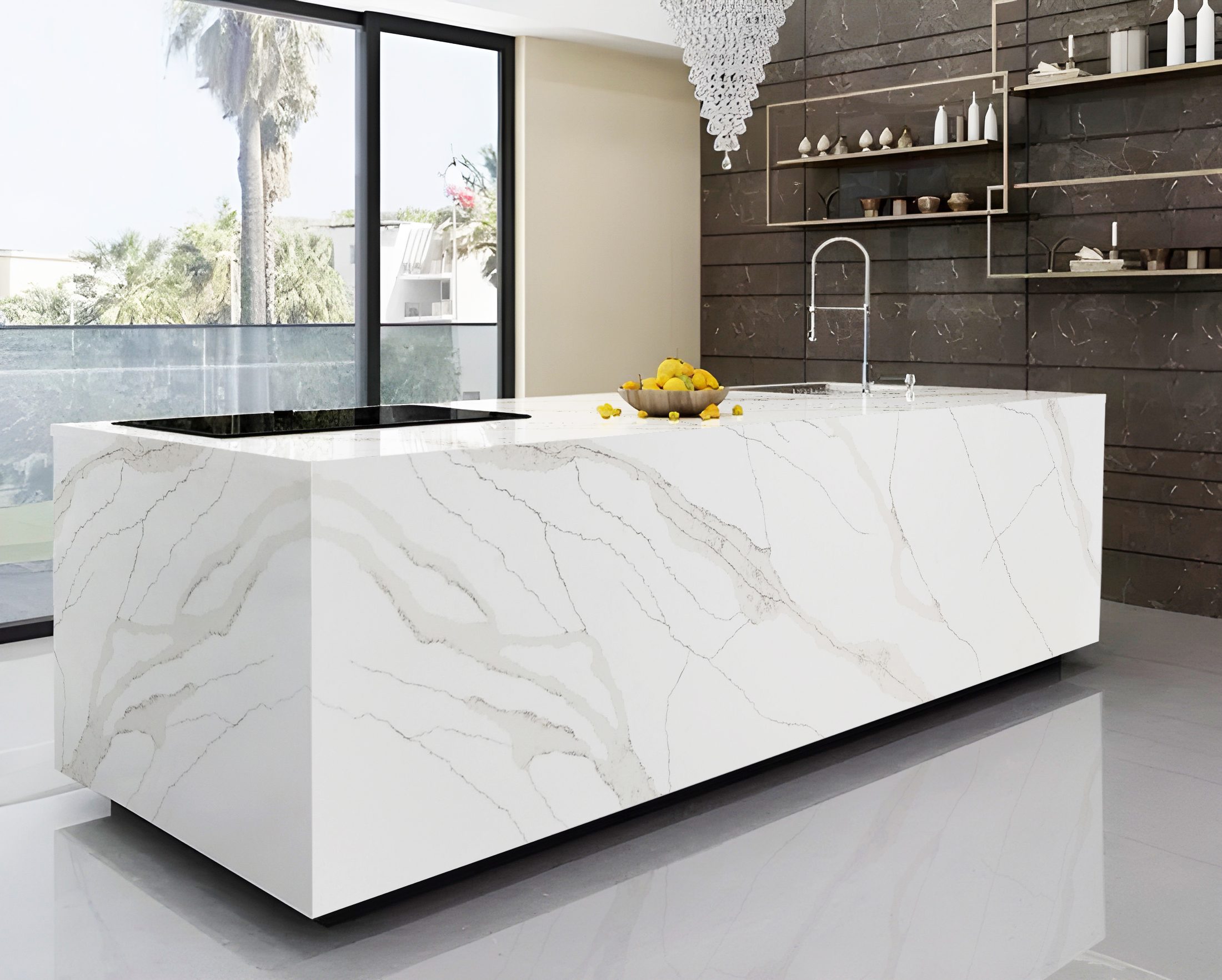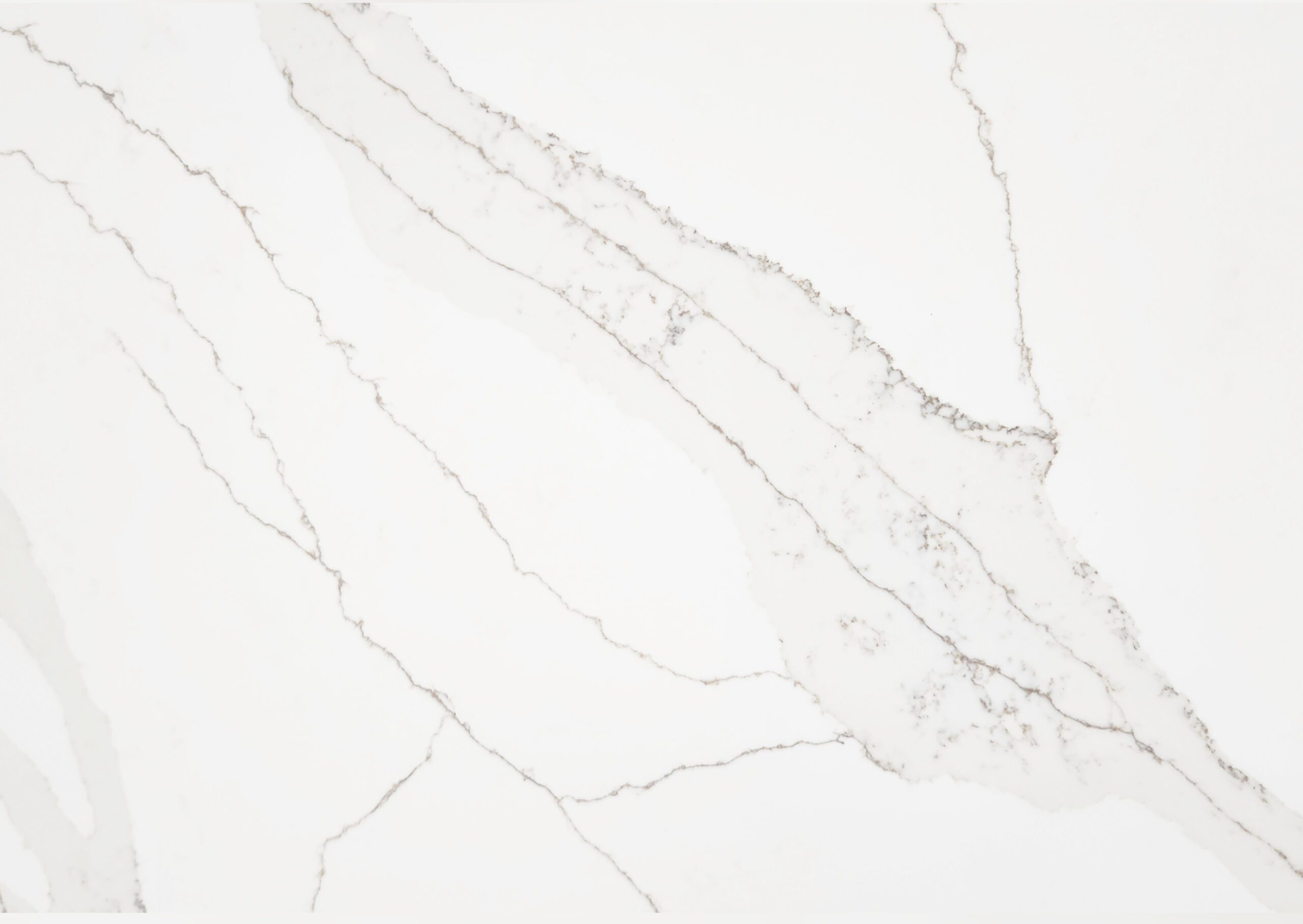 Aurora has a beautiful white canvas with warm beige veining with intricate detailing that runs across the slab coupled with sweeping grey veins.