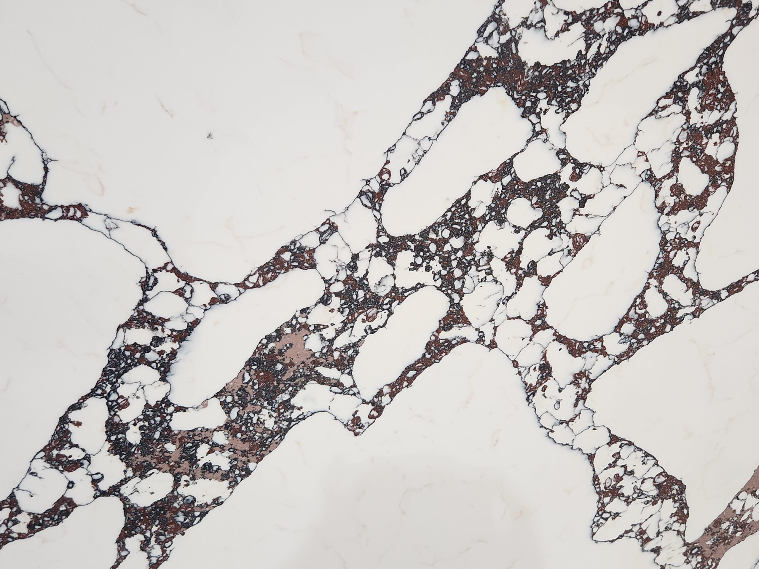 Calacutta Viola showcases a white background with wisps of warmth, and veining that has deep violet, maroon, and brown, creating a bold and dynamic visual impact.