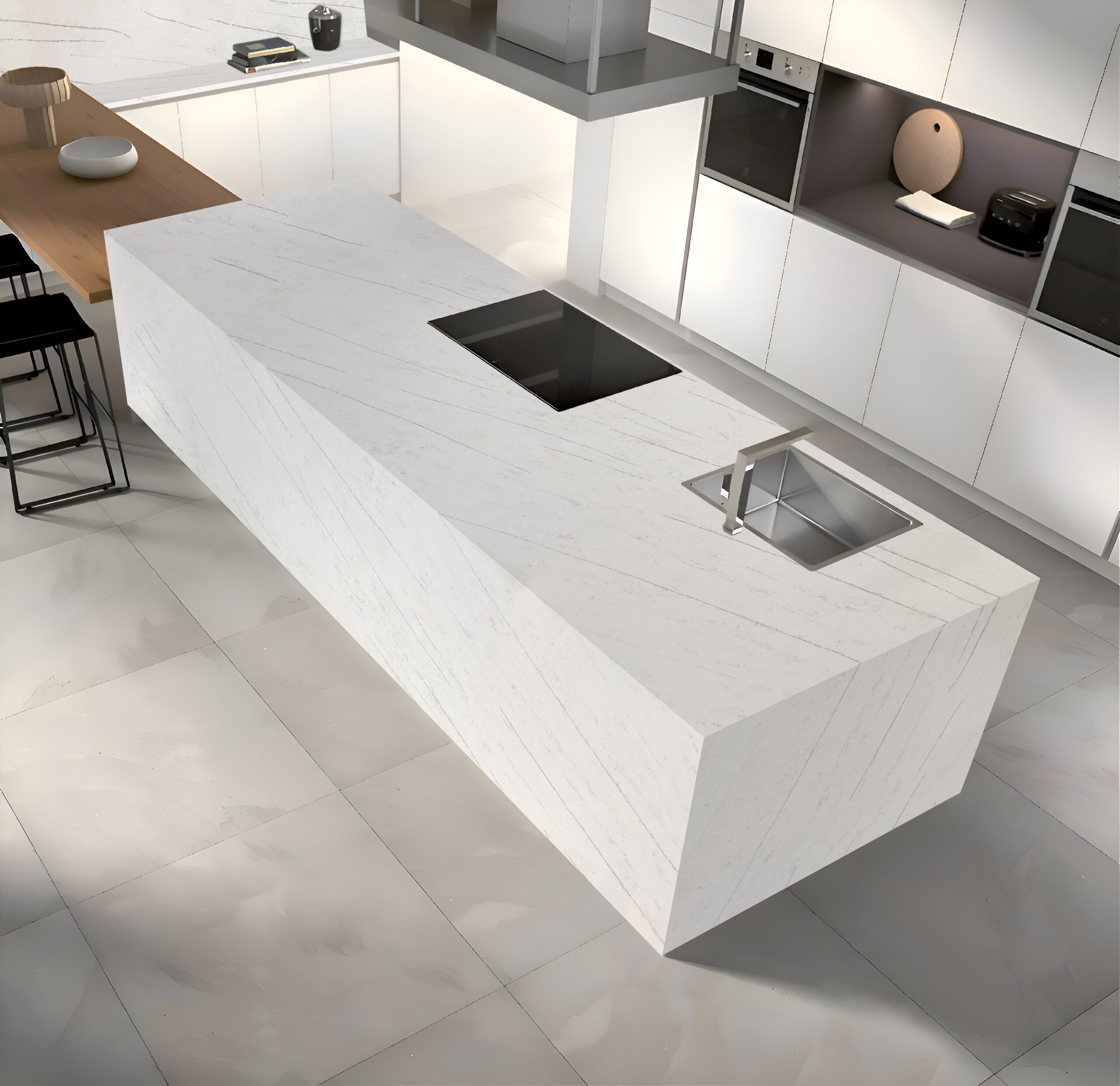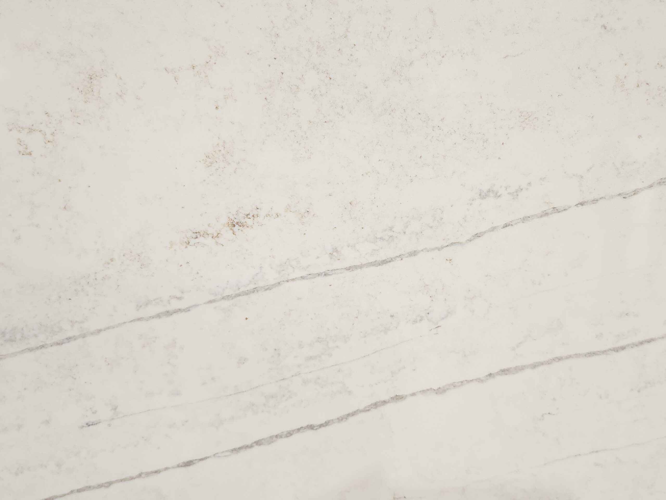 Mont Blanc has a beige background, with cool and warm pigments that are randomly distributed across the slab, encompassed by linear deep grey veining.
