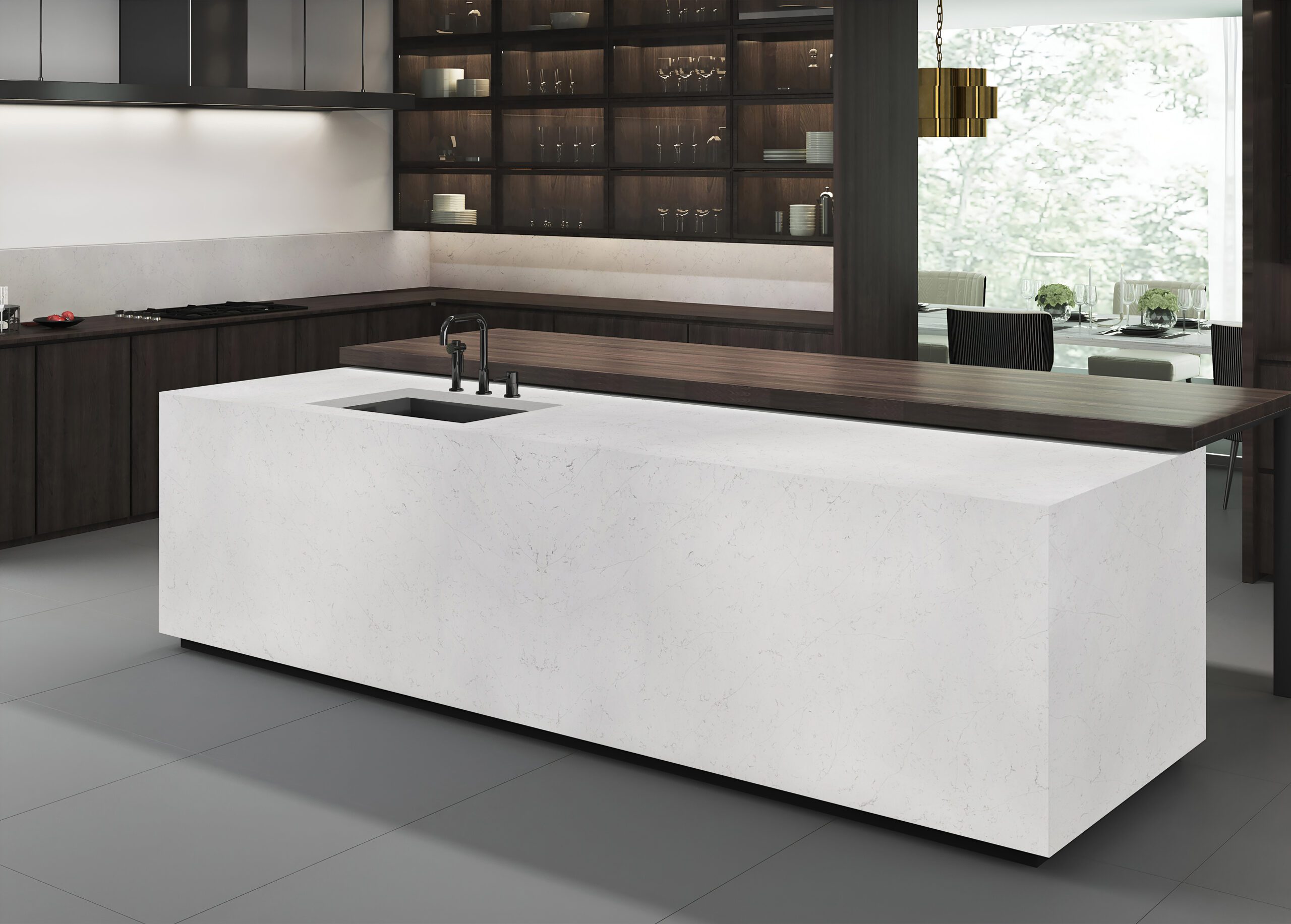 New Carrara is timeless, with a captivating white background and elegant wisps of grey veining floating throughout the slab.